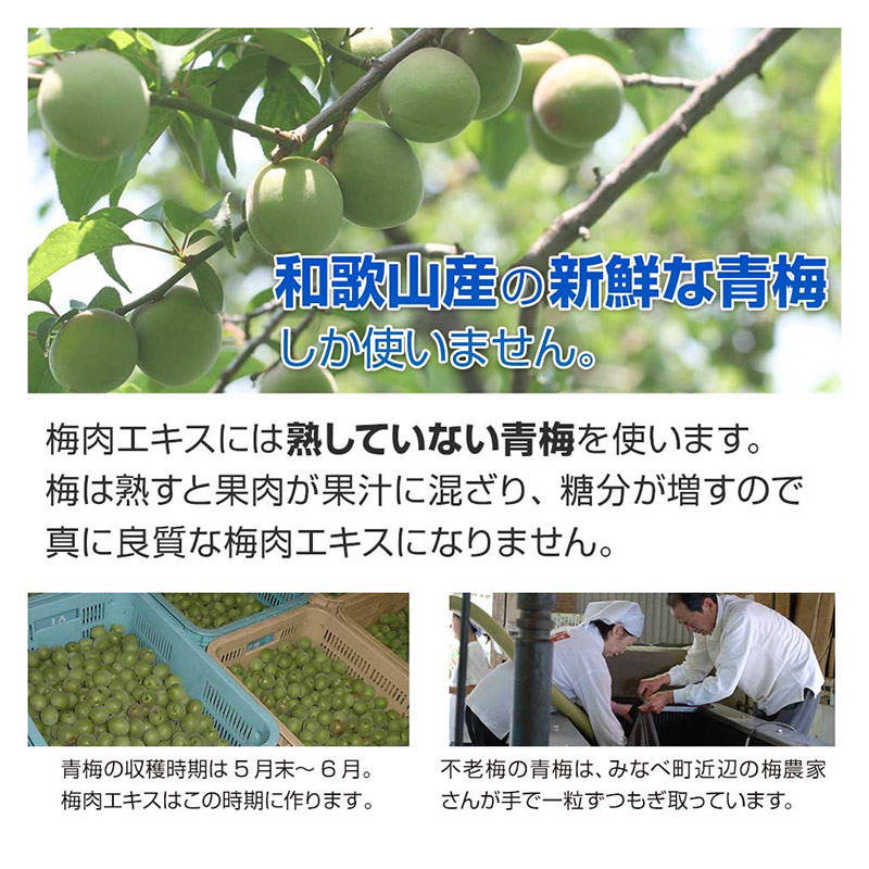 和歌山県みなべ町近辺の梅農家さんが手で一粒ずつもぎ取った新鮮な青梅を使っています。