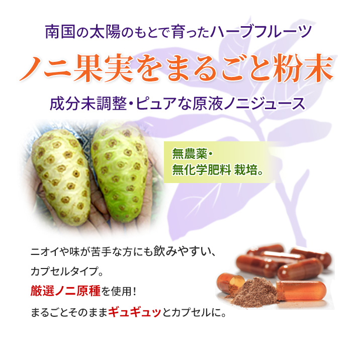「ドクターノニ カプセル」は、種子を除いたノニ果実をまるごと粉末にしたカプセルタイプです。