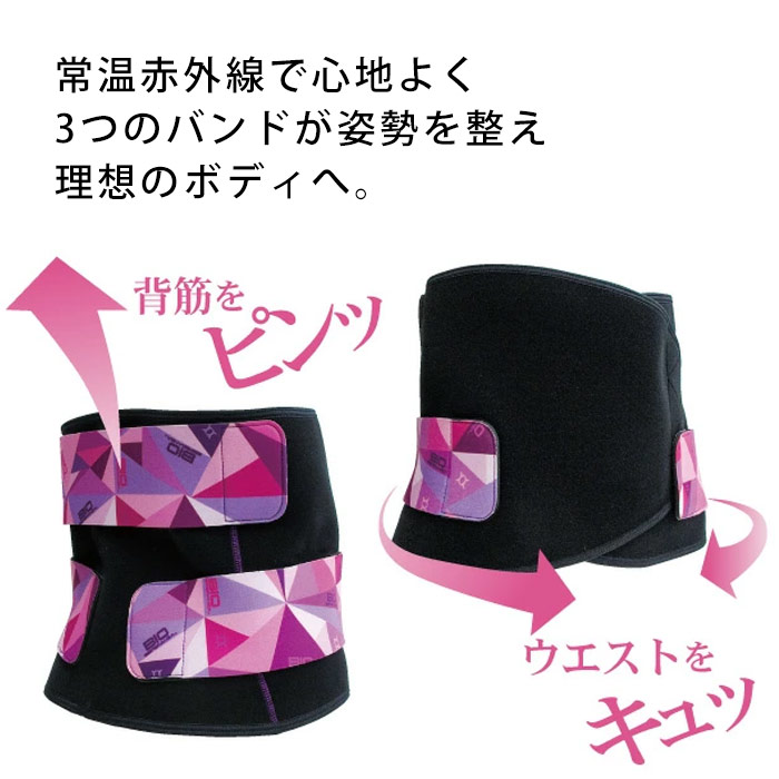 背中のバンドが背筋を支え、両サイドのバンドがカラダの横ブレを軽減し、カラダを楽に綺麗に魅せる姿勢へと導きます。