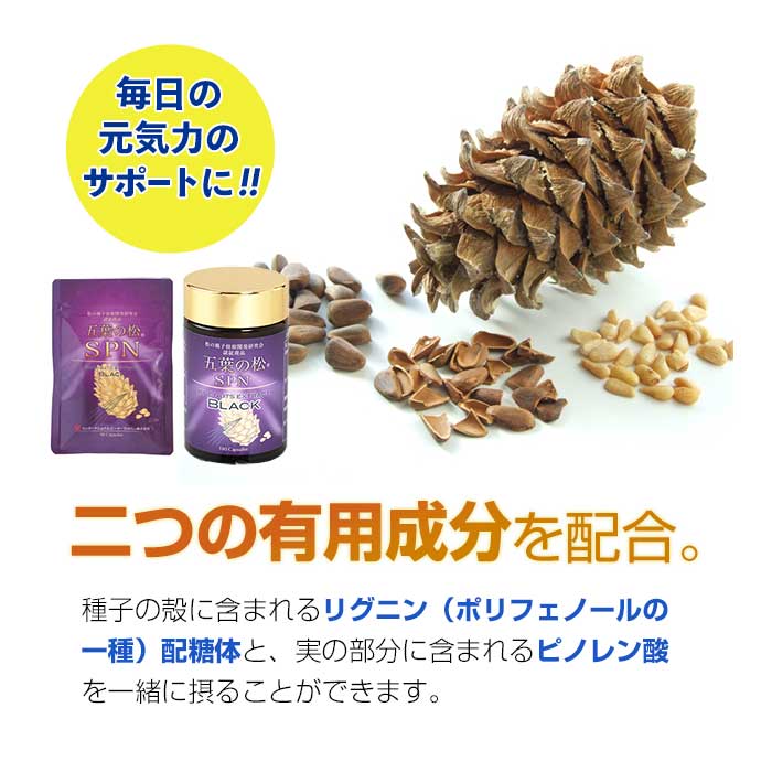 「五葉の松SPNブラック」は、五葉松の種子エキスSPNと、松の実オイル(五葉松の種子から取れる「実」と「殻」の両方)が配合されたサプリメントです。
