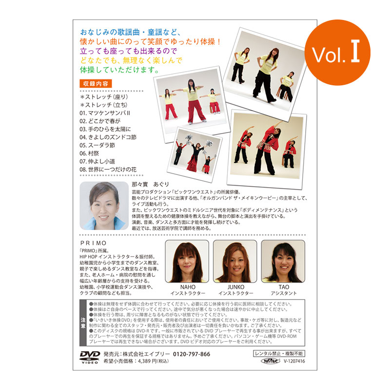 | 収録内容 | ストレッチ体操(座り・立ち) ①マツケンサンバⅡ ②どこかで春が ③手のひらを太陽に ④キヨシのズンドコ節 ⑤スーダラ節 ⑥村祭 ⑦仲良し小道 ⑧世界でひとつだけの花 |