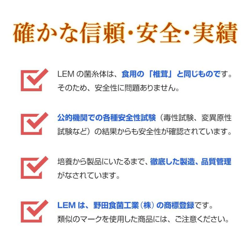 また、LEMの安全性は公的機関での各種安全性試験(毒性試験、変異原性試験など)の結果からも確認されています。