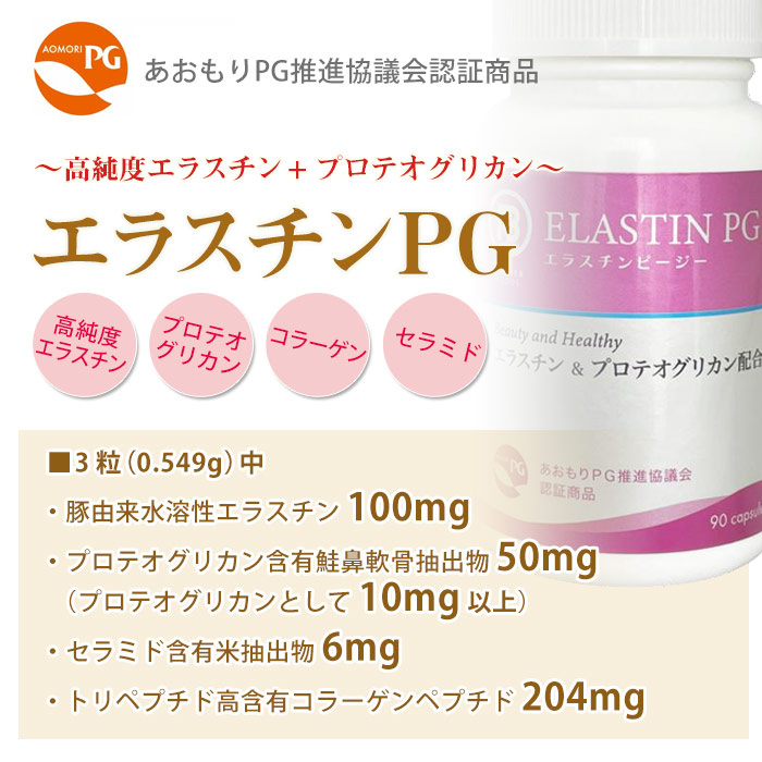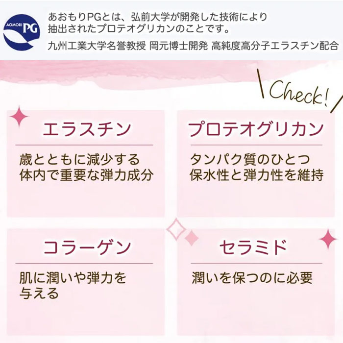 「エラスチンPG」は、九州工業大学名誉教授(岡本博士)が開発した高純度・豚由来の水溶性エラスチンを配合。さらに、鮭由来のプロテオグリカンも高配合。