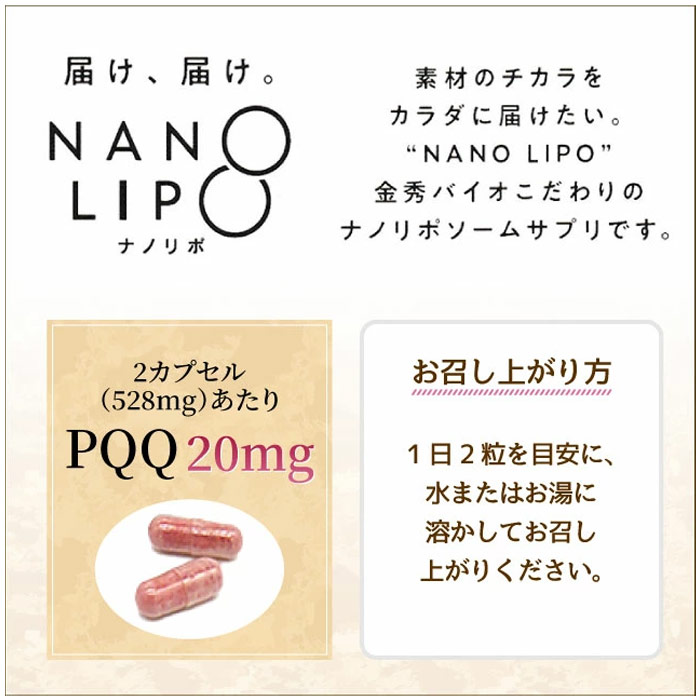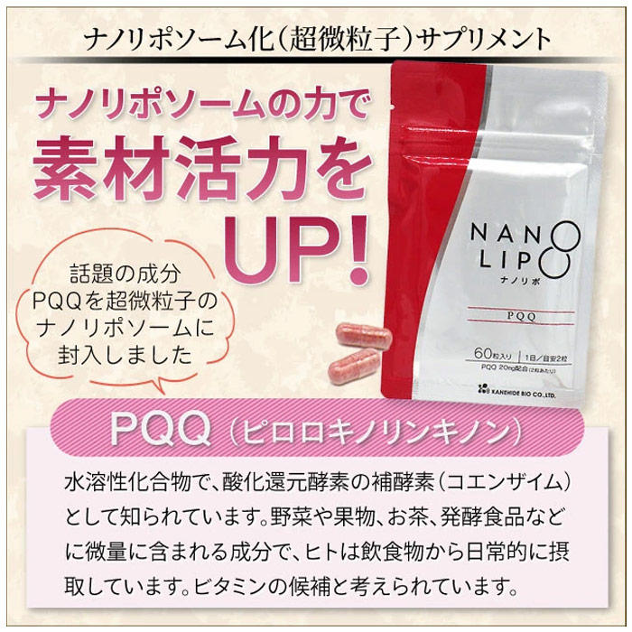「ナノリポPQQ」は、独自のナノテクノロジーを活用してPQQ(ピロロキノリンキノン・2Na塩)を超微粒子のナノリポソームに封入しました。