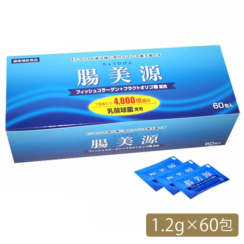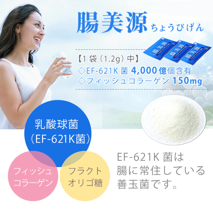 「腸美源」は、腸内善玉菌の最高の乳酸球【EF-621K菌】に、【フィッシュコラーゲン】と【フラクトオリゴ糖】を配合した、体内美容サポート食品です。
