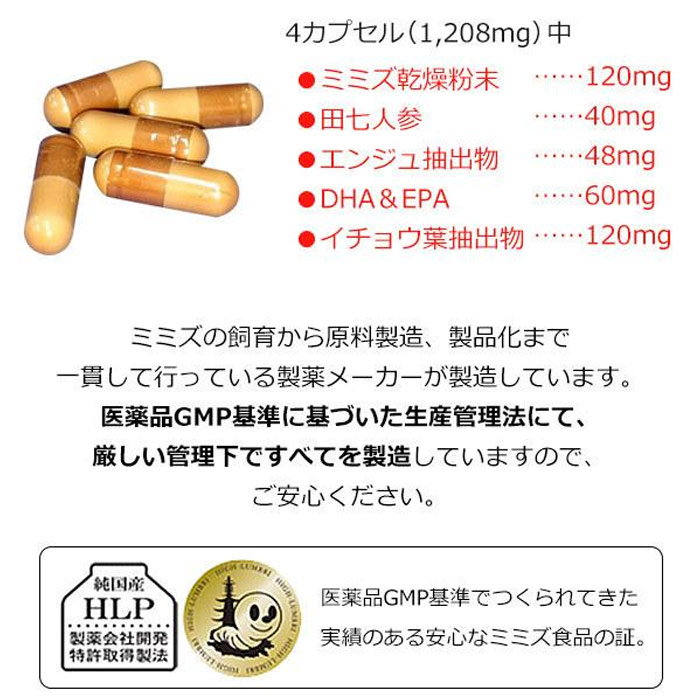 ●ミミズ乾燥粉末 120mg ●田七人参 40mg ●エンジュ抽出物 48mg ●DHA&EPA 60mg ●イチョウ葉抽出物 120mg