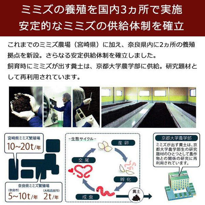 現在は、これまでのミミズ農場(宮崎県)に加え、新たに奈良県内に2ヵ所の養殖拠点を設け、さらなる安定供給体制を確立しました。飼育時にミミズが出す糞土は京都大学農学部に供給し、研究題材として再利用されています。