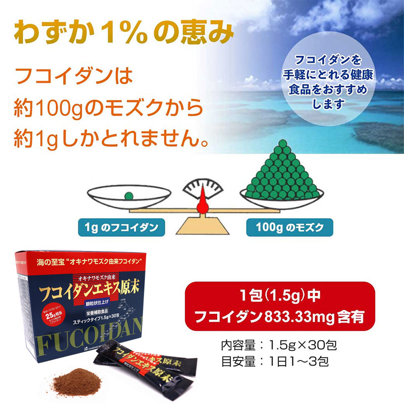 オキナワモズクにはフコイダンが豊富に含まれていると、そのまま食べても良さそうだと思われるかもしれません。しかし、生のモズク100gから抽出できる純粋なフコイダンの量はわずか1gといわれています。スーパーなどに売られているモズクのパックでは1日に多量に食べなければなりません。