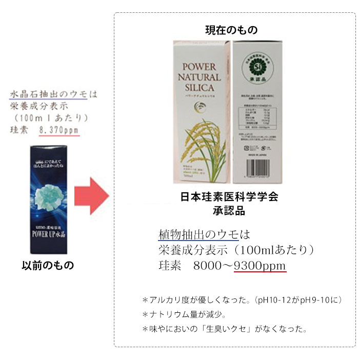 「パワーナチュラルシリカ(umo・水溶性珪素濃縮溶液)」は、国内生産された稲穂の籾殻を低温焼成法で燃焼させ、溶解及びろ過処理により、価値ある成分だけをアモルファス(非結晶)で抽出した水溶性珪素であり、完全に水に溶解する食用珪素です。