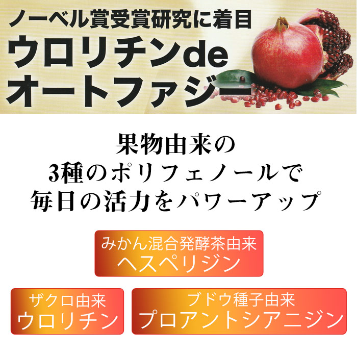 「ウロリチンdeオートファジー」は、果物由来の3種のポリフェノール、ザクロ(ウロリチン)・みかん(ヘスペリジン)・ブドウ(ブドウ種子プロアントシアニジン)を配合した“オートファジー”サポートサプリです。