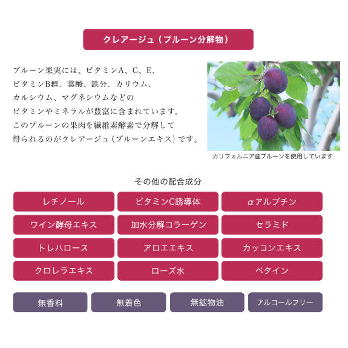 | 成分 | 水、BG、グリセリン、ローズ水、ペンチレングリコール、ビタミンA油、テトラヘキシルでかん酸アスコルビル、トコフェロール、α-アルブチン、プルーン分解物、加水分解コラーゲン、アロエベラ葉エキス、カッコンエキス、クロレラエキス、グリコシルトレハロース、加水分解水添デンプン、スフィンゴモナスエキス、酵母エキス、グリチルリチン酸2K、ベタイン、リゾレシチン、水添レシチン、アラニン、ソルビトール、マルチトール、DPG、ジグリセリン、コレステロール、アルギン酸Na、キサンタンガム、乳化Ca、エタノール、フェノキシエタノール |