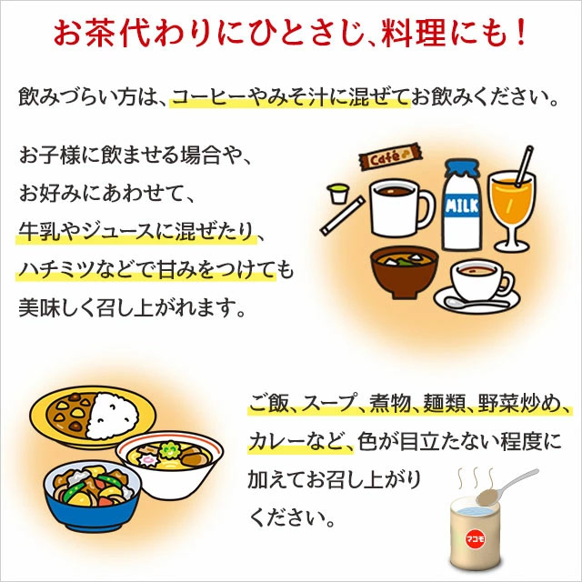 ◆お子様に飲ませるときは、ミルクや牛乳・みそ汁などに混ぜてもよく、また、ハチミツやジュースなどで甘味をつけてもおいしく召し上がれます。