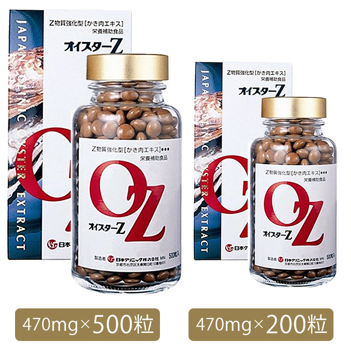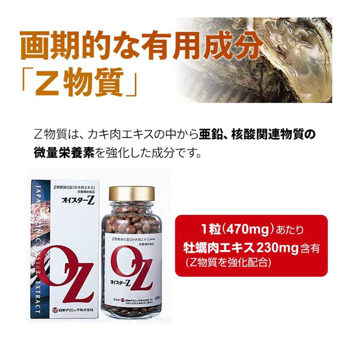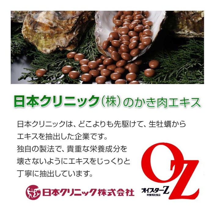 オイスターZは、生かきの栄養成分を損なうことなく、日本クリニック独自の製法(特許第1170901号)により抽出した『かき肉エキス』中の有用成分(Z物質など)を、より強化して作られた栄養補助食品です。