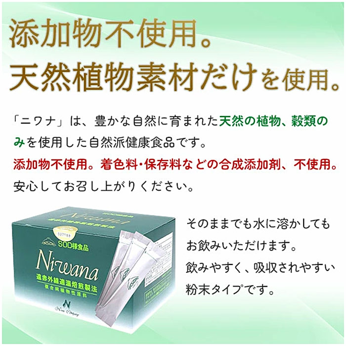 「ニワナ」は、SOD様物質が豊富な天然の種子・植物だけを使用し、特許製法により加工を施した無添加の穀物加工食品です。
